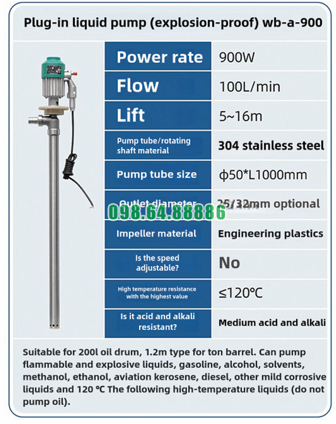 Máy bơm chất lỏng cắm trực tiếp chống cháy nổ WB-A-900 phục vụ việc chiết rót từ thùng phuy 200 lít