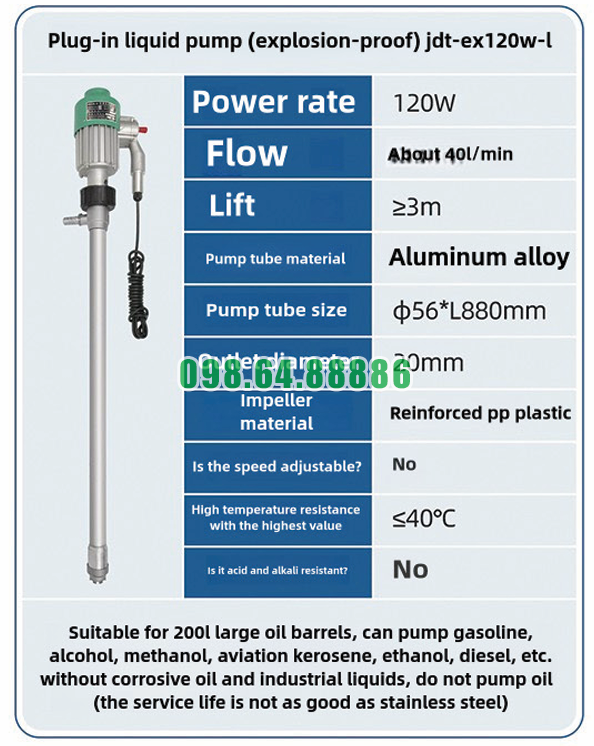 Máy bơm chất lỏng cắm trực tiếp chống cháy nổ JDT-EX120W-L phù hợp với các loại dung môi Ethanol