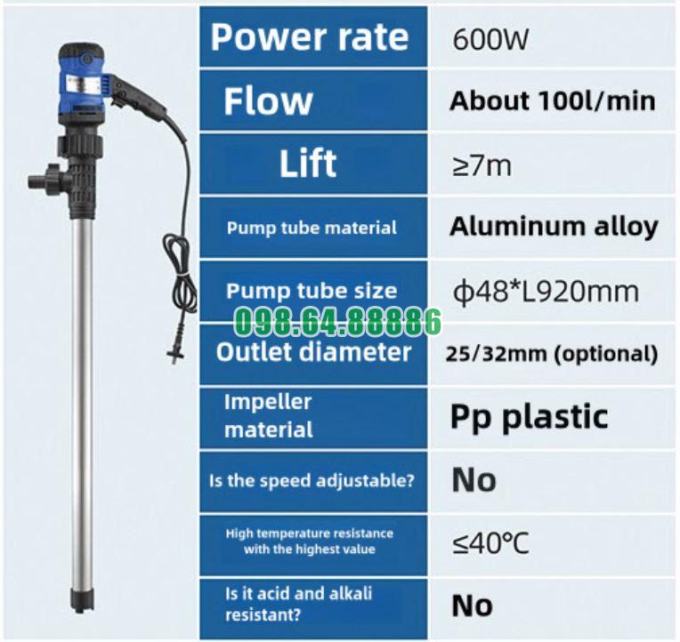 Máy bơm thùng phuy điện model JDT-L92-600W là thiết bị chuyên dụng trong các ngành công nghiệp cần chiết rót, vận chuyển dầu, dung môi, hóa chất hoặc các loại chất lỏng từ phuy 200L. Với cấu tạo hiện đại, vật liệu bền bỉ và hiệu suất cao, model này trở thành lựa chọn phổ biến trong nhà máy, xưởng sản xuất và kho hóa chất.