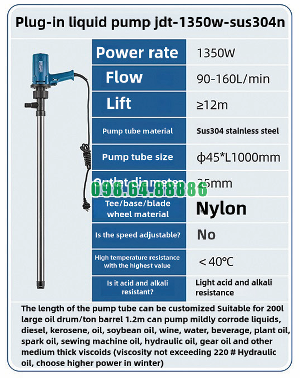 Máy bơm hút chất lỏng công nghiệp JDT-1350W-SUS304N