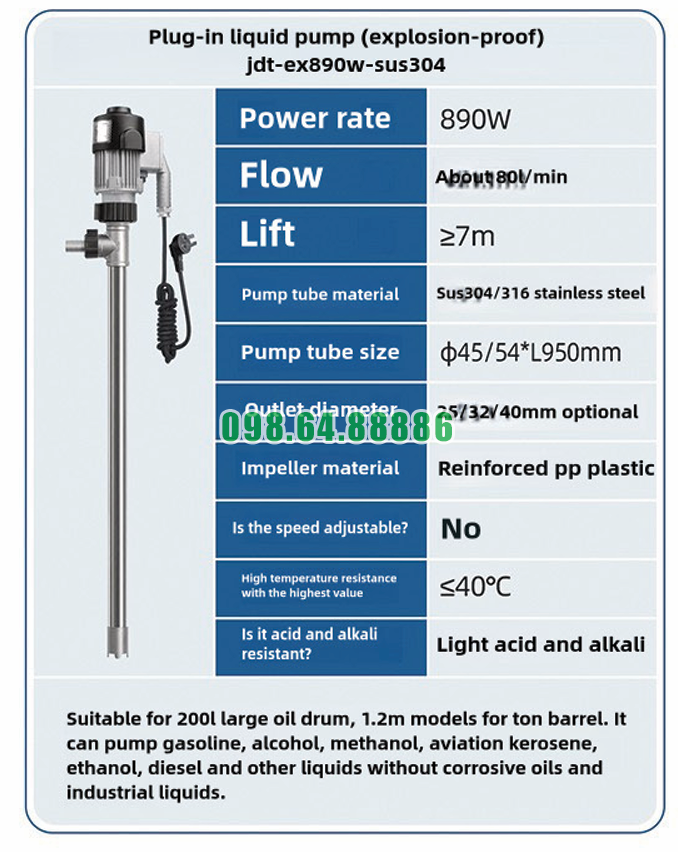 Máy bơm chất lỏng cắm trực tiếp chống cháy nổ JDT-EX890W-SUS304 hoạt động an toàn trong các khu vực chứa xăng, dầu, dung môi và hóa chất dễ cháy.
