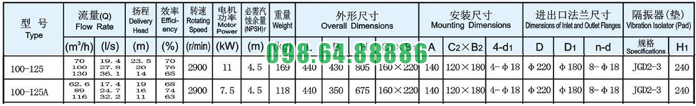 Thông số kỹ thuật và kích thước bơm model ISG100-125