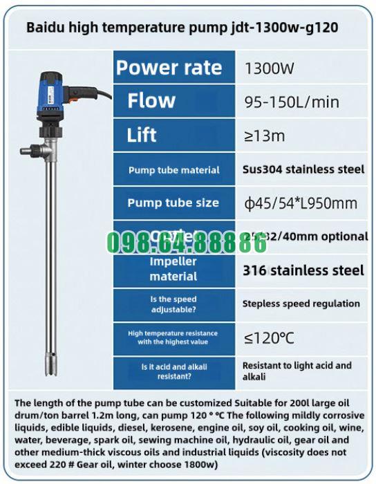 Để tối ưu hóa vận hành bơm thùng phuy nhiệt độ cao JDT-1300W-G120, chỉ cần tập trung vào 6 yếu tố then chốt: đúng nhiệt độ – giảm độ nhớt – lắp đặt chuẩn – vận hành đúng tải – dùng đúng chất lỏng – bảo dưỡng định kỳ. Khi thực hiện tốt các nguyên tắc này, bơm sẽ hoạt động êm ái, an toàn và bền bỉ trong mọi ứng dụng bơm thùng phuy nhiệt độ cao.