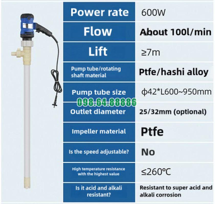 Bơm điện thùng phuy hóa chất JDT-600W-PTFE