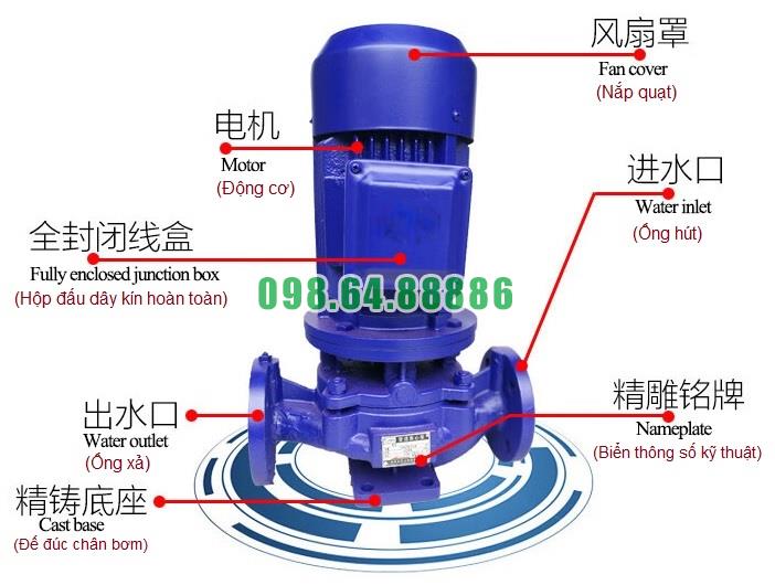 Máy bơm cấp nước trục đứng, bơm inline ISG80-250A, IRG80-250A 18.5kw, 46.8m3, 70m