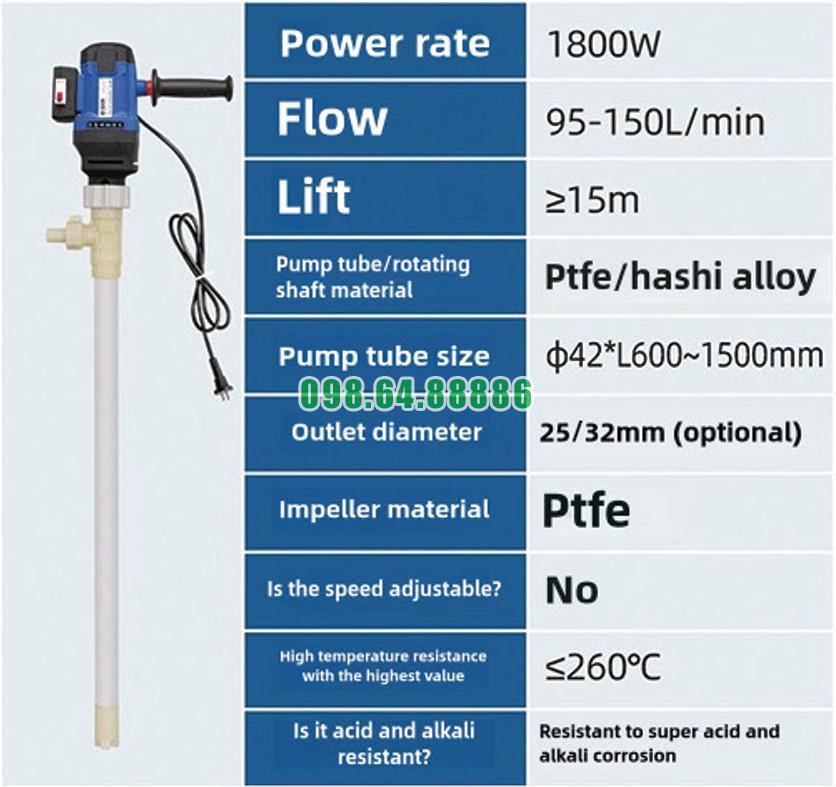 Giải pháp chuyển đổi chất lỏng bằng Bơm điệnthùng phuy 200L JDT-1800W-PTFE đặc biệt phù hợp với môi trường hóa chất côngnghiệp.